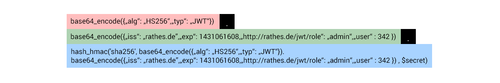 eyJhbGciOiJIUzI1NiIsInR5cCI6IkpXVCJ9 + . + eyJpc3MiOiJyYXRoZXMuZGUiLCJleHAiOjE0MzEwNjE2MDgsImh0dHA6Ly9yYXRoZXMuZGUvand0L3JvbGUiOiJhZG1pbiIsInVzZXIiOjM0Mn0=